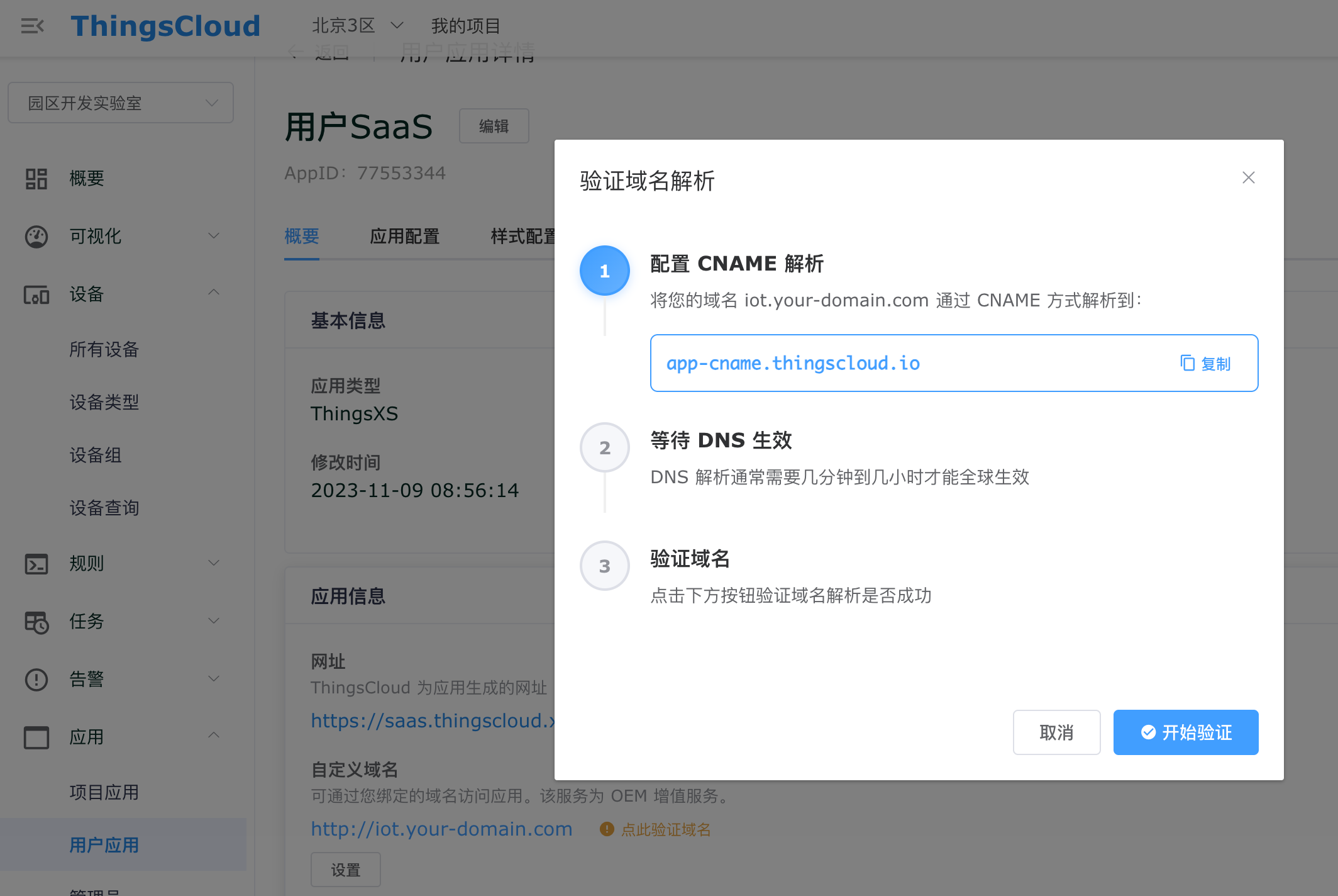 按照平台提示,在您的域名管理系统添加 CNAME 解析记录,将您的域名指向 ThingsCloud 平台。这个过程通常只需要几分钟。