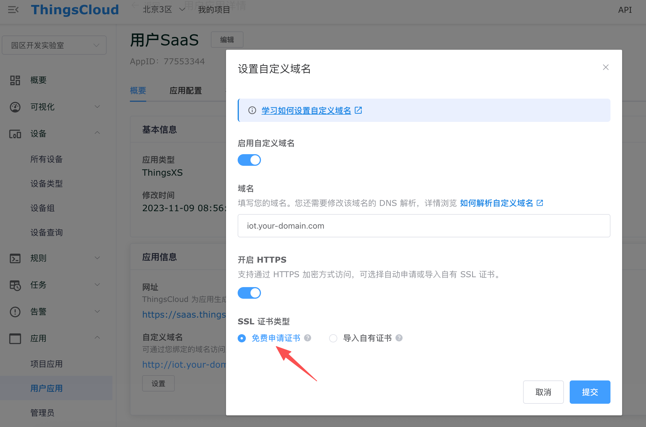 首先,您需要为应用绑定自定义域名。在应用设置中找到自定义域名配置选项,填写您想要使用的域名(如 iot.your-domain.com)。