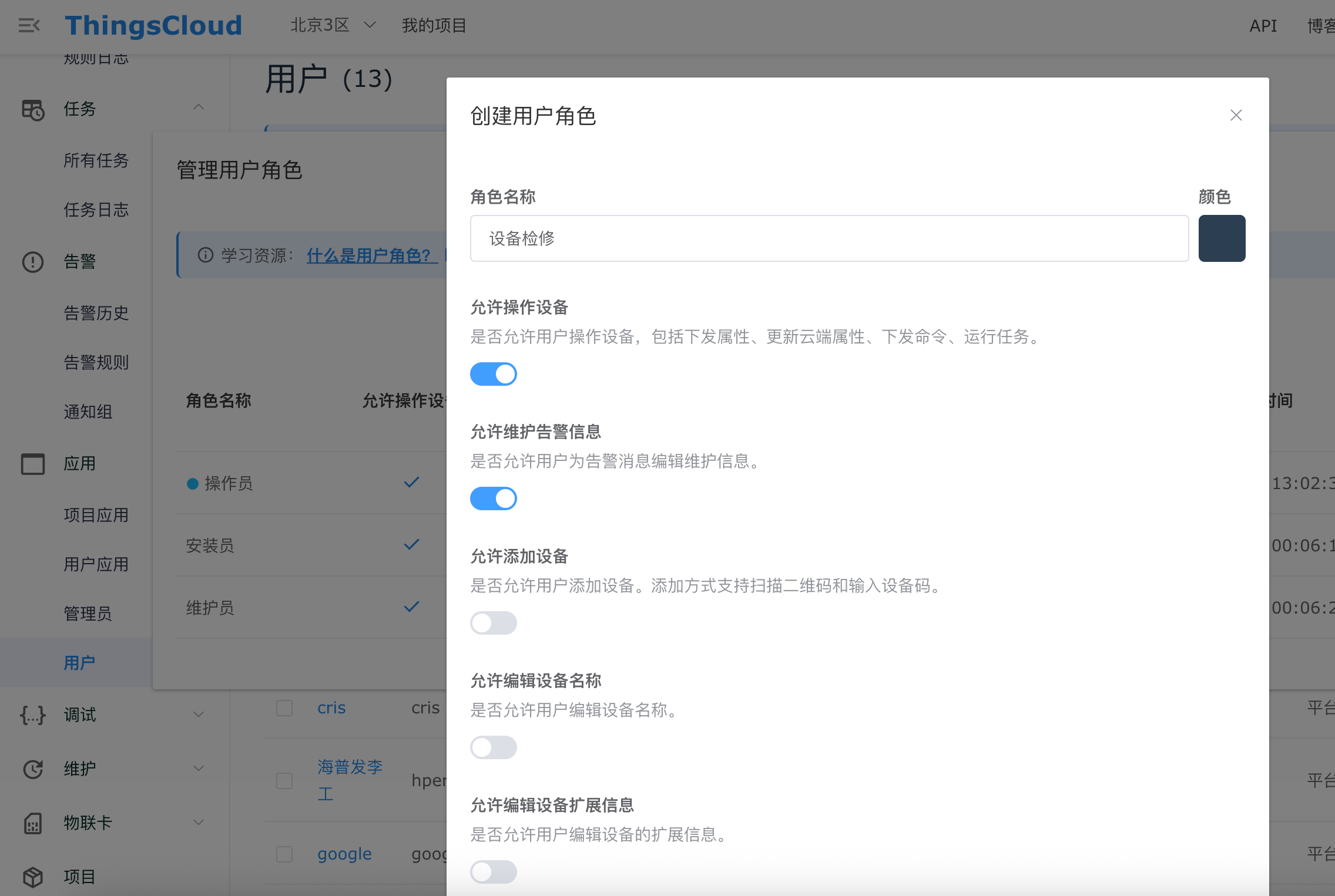 在 ThingsCloud 的项目中,支持多用户体系。